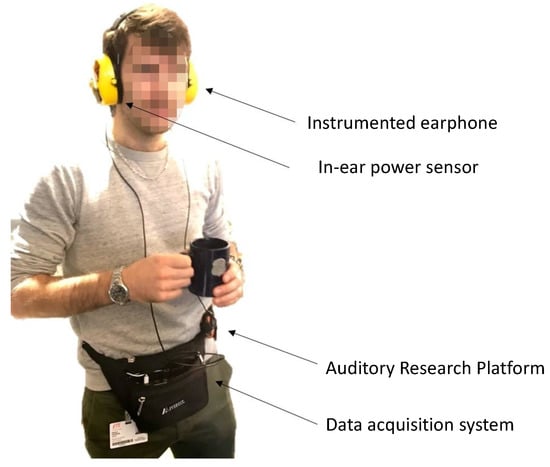 The Auditory Research Platform (ARP 3.0) and its associated data acquisition system developed in the authors’ laboratory (CRITIAS, Montréal, QC, Canada) are used for both audio and pressure signal acquisition. The ARP uses a tactile screen and Windows operating system and is placed inside a waist bag carried by the subject during the test as shown in Figure 3. A rechargeable battery is also placed in the bag to power the pressure sensor and the analog front-end by a wire running to the earcup.