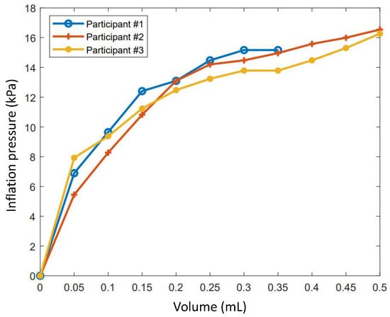 Earplug pressure–volume curves for three test subjects during inflation of the earplug within the earcanal.