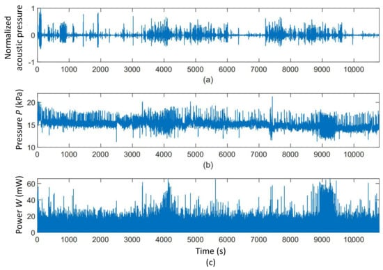 Audio, pressure and instantaneous power signals. (a) Audio, (b) Pressure and (c) Instantaneous power signals.