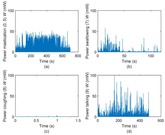 According to Figure 6, the variation of the calculated power associated with chewing is quite consistent given the regular rhythm of chewing that a person normally maintains while eating. The power associated with talking is more volatile depending on the uttered words, speaking pace and voice loudness. Swallowing exhibits more discrete power regions due to its low frequency profile. Finally, the power diagram for coughing shows more distinct and isolated peaks due to its spontaneous occurrence.