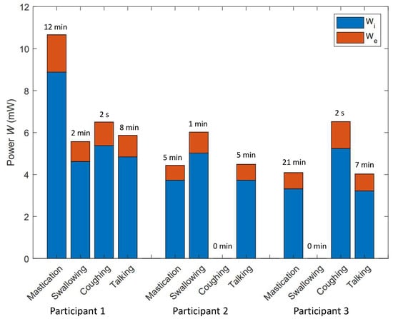 A high instantaneous power peak does not necessarily mean that the corresponding jaw activity has the greatest potential for energy harvesting. For example the coughing event seen in Figure 6 can generate more than at its maximum peak, which is much higher than the maximum power peak for the chewing event. However, coughing happens sporadically and lasts less than a second, while chewing is continuous and lasts several minutes. Therefore, the segmented power diagrams are subsequently used in Equation (4) to obtain the total energy and eventually Equation (5) is used to calculate the mean power associated with each jaw joint activity. The mean power generated by the internal pressure () and elastic deformation () components as well as the duration of each jaw movement-related event are reported in Figure 7 for all test subjects.