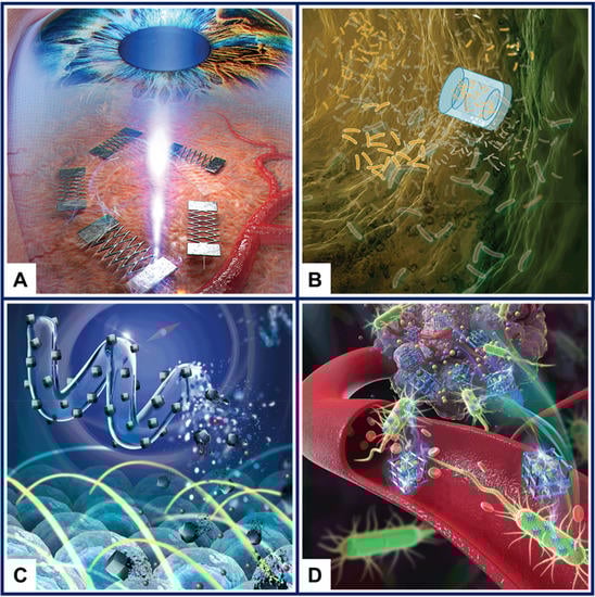 Conceptual drawings showing microswimmers with biomedical applications. (A) Laser-controlled Ni/Ti shape memory alloy microswimmer for intraocular surgery. Figure reproduced from the front cover of Advanced Materials Technologies, [14], © 2019 WILEY-VCH Verlag GmbH. (B) Microcontainers for improved biofilm treatment. Figure reproduced from the front cover of Advanced Healthcare Materials, [15], © 2020 WILEY-VCH Verlag GmbH. (C) Biodegradable metal-organic framework-based microswimmer for targeted drug delivery. Figure reproduced from the front cover of Advanced Healthcare Materials, [16], © 2020 Wiley-VCH GmbH. (D) Biohybrid microrobot comprising Escherichia coli biomineralized using a metal–organic framework employed for targeted drug delivery. Figure reproduced from the back cover of Advanced Healthcare Materials, [17], © 2020 WILEY-VCH Verlag GmbH.