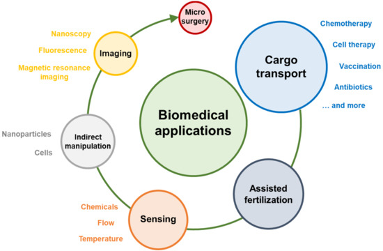 Although definitely interesting, the many actuation and fabrication strategies will not be further described as such as part of this review, which is instead focused on microswimmer applications. While some pioneering works, unique examples, or other review papers are mentioned briefly, this paper expands on interesting examples of microswimmers for biomedical applications reported in the last two years.