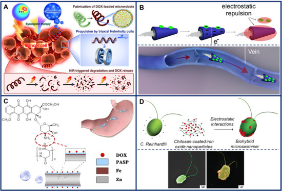 - Wang, X.; Cai, J.; Sun, L.; Zhang, S.; Gong, D.; Li, X.; Yue, S.; Feng, L.; Zhang, D. Facile fabrication of magnetic microrobots based on spirulina templates for targeted delivery and synergistic chemo-photothermal therapy. ACS Appl. Mater. Interfaces 2019, 11, 4745–4756. [Google Scholar] [CrossRef] [PubMed]