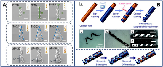 Recent examples of microswimmers developed for cell therapy. (A) Scanning electron micrographs of hollow microhelix magnetic microswimmers able to transport nanoparticles and cells. Scale bars, 20 µm. Figure reproduced from [82], © 2019 WILEY-VCH Verlag GmbH & Co. (B) Piezoelectric magnetic microswimmers for cell differentiation into neurons and subsequent delivery. Top: (a) fabrication steps. (b,c) Optical images of microswimmers with different design parameters. (d,e) Micrographs of microswimmers with and without a “head”. Bottom: cell culture and differentiation schematics. Figure reproduced from [84], © 2019 by the authors (Creative Commons Attribution license).