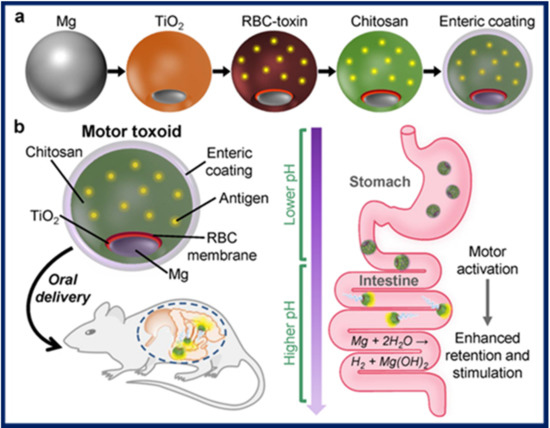 (a) Microswimmer fabrication steps: magnesium microparticles are first partially coated with titania, then with a red blood cell (RBC) membrane containing the toxin, chitosan for mucoadhesion, and finally with an enteric coating resistant to acidic pH. (b) Principle of action for oral vaccination in mice using the microswimmers (motor toxoids) as delivery agents. Figure reproduced from [87], © 2019 American Chemical Society.
