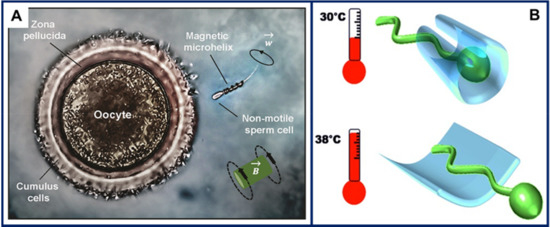 Spermbots for assisted fertilization. (A) An immotile sperm cell is captured by a remotely controlled magnetic helix and delivered to the oocyte for fertilization. Figure reproduced from [1], © 2015 American Chemical Society. (B) Thin thermoresponsive ferromagnetic multilayers roll into microtubes to help capture sperm cells and remotely control them by external magnetic fields. The polymeric spermbots are propelled by the sperm flagella. When the temperature is increased, the microtubes unfold and the sperm cell is released. Figure reproduced from [94], © 2016 WILEY-VCH Verlag GmbH & Co.