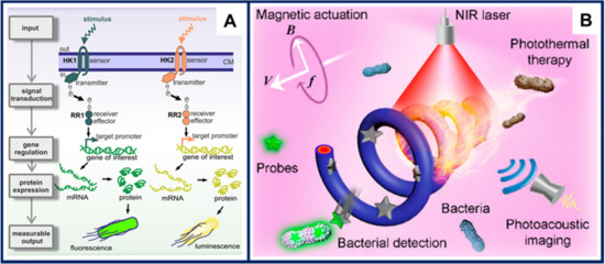 Biohybrid microswimmers based on Bacillus subtilis and abiotic particles were reported by Sun et al. [105]. Interestingly, the bacterial components were genetically engineered to express fluorescent proteins upon encountering certain environmental stimuli. More specifically, two populations of microswimmers able to sense the antibiotic bacitracin were demonstrated. The first one expressed the mCherry red fluorescent protein, while the second expressed the green fluorescent protein (GFP). The cascade of biological processes leading from an environmental input to a measurable output, known as signal transduction pathway, is shown in Figure 7A.