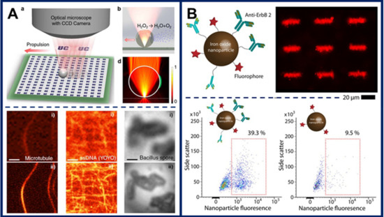 The use of microswimmers for optical nanoscopy enabling sub-diffraction resolution was demonstrated by Li et al. [115]. For this purpose, they fabricated Janus microswimmers made of high refractive index polystyrene or of titania microspheres partially coated with a thin titanium/nickel/platinum metallic trilayer. In the presence of hydrogen peroxide fuel, the asymmetric microswimmers swim autonomously, powered by platinum-catalyzed fuel decomposition. This motion is complemented by magnetic actuation enabled by the nickel component. At the microscale, each microswimmer acts as a magnifying lens, whereas motion control enables precise positioning near the features of interest and scanning of relatively large areas of a sample in a short amount of time. After suitable image processing, features as small as 20 nm could be resolved, and high-resolution imaging of neuron axons, microtubulin, Bacillus spores, and DNA nanotubes was demonstrated (Figure 8A).