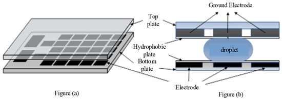 On the DMFB analysis system, each droplet can be controlled independently, and each cell in the array has the same structure. Therefore, a DMFB consists of a two-dimensional (2D) electrode array and some peripheral devices, including the detecting sensor and dispensing port, as shown in Figure 1. Figure 1a shows a 2D electrode array. Figure 1b shows a cross-sectional view of the DMFB. The basic droplet movement is based on the electrowetting on dielectric (EWOD) principle [11,12,13]. Hence, the operations can be executed anywhere on the chip by occupying a set of electrodes in a reconfigurable way. By applying a series of voltages to adjacent control electrodes, the droplets between the top and bottom plates move to different cells, as expected. The sensors on the DMFB have multiple functions. The reaction product can be detected by an integrated light-emitting diode (LED)–photodiode sensor. A DMFB with a sensing feedback signal can monitor intermediate products during execution [14].