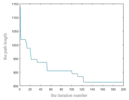 To analyze the convergence of the algorithm, we used the iteration number as the horizontal axis and the optimal solution in each generation as the longitudinal axis to draw the convergence curve of the algorithm, as shown in Figure 5. As the iteration continued, the path length decreased continuously, and the path length became stable at 868 when the number of iterations was 122. The droplets needed 0.01 s for each moving electrode unit; thus, the droplets were mixed along the path, and the mixing time required was 8.86 s.