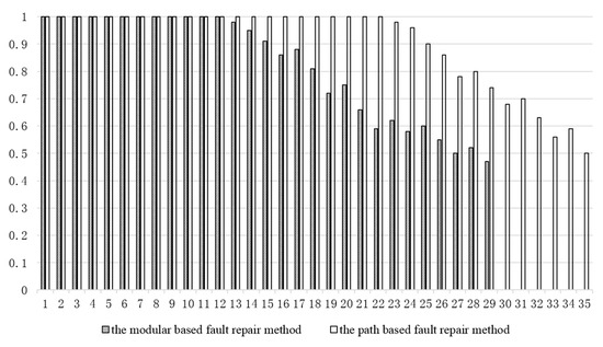 Comparison of the modular fault repair method based on the genetic algorithm and the heuristic routing-based fault repair method.