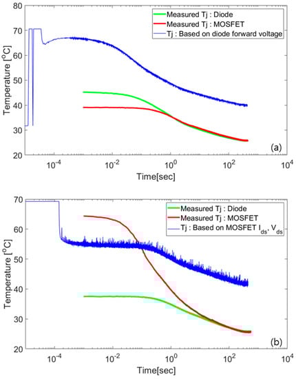 Figure 1 compares the junction temperatures measured by fiber optics and derived from TSEPs. The green and red lines are the Tj values measured by the fiber optics for a SiC diode and MOSFET, respectively. During the Tj measurement, either the MOSFET or diode is cooled after applying and removing the load current of 100 A. This process simultaneously heats the MOSFET body diode and its anti-parallel diode and changes their electrical parameters. The forward voltage (Vf) of the diode is monitored as its TSEP and plotted by the blue line in Figure 1a. The TSEP of the MOSFET is derived from the relationship between the drain–source current (Ids) and voltage (Vds) under low current (below 100mA), which is expressed by the blue line in Figure 1b.