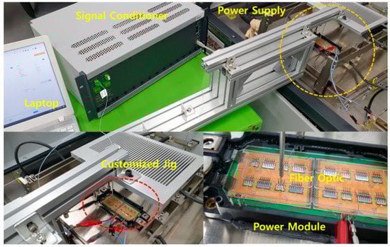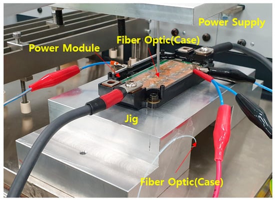 The SiC MOSFET power module (SPX300GB120C2S6-2, Semipowerex) is used to validate the proposed method. The module is a 1200 V 300 A half-bridge inverter with four parallel SiC MOSFETs and four parallel SBDs. The direct bonded copper (DBC) is composed of copper and alumina substrate. To heat the SiC MOSFET, the load current is applied using a power source (Mentor Graphics). The power source has a function to measure the drain-source voltage. The power dissipation of the SiC MOSFET is calculated using the measured current load and drain-source voltage. The junction temperature is monitored by an fiber optic sensor (manufactured by OPSENS) with a resolution of 0.05 °C and temperature measurement range of −40 to 250 °C. The fiber optic sensor has low nonlinearity and electrical insulation, and thus is suitable for power device applications. In addition, the junction temperature can be measured even with the gels on the power module. The temperature distribution in the devices can be accurately measured through multi-point sensing. The flexible temperature sensor wire is guided by a customized aluminum fixture with an aluminum tube guide. The sensor tip is touched on the SiC MOSFET to measure the junction temperature. The measured signal is recorded by the signal conditioner, which provides a sampling rate of 1 kHz. The measurement system setup is shown in Figure 3, and its specifications and equipment used are listed in Table 2.