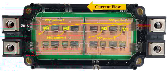 Power modules with high power densities are increasingly in demand for various applications, including electrified vehicles, transportations, and renewable energy systems [,,]. The reliabilities and performances of power modules are strongly dependent on the selection of switching devices. Recently, wide-band-gap devices such as SiC and gallium nitride (GaN) devices have been actively studied because of their potential to overcome the limitations of Si devices [,,]. For high-power applications, SiC metal-oxide semiconductor field-effect transistors (MOSFETs) are commonly used for parallel operations [,]. In addition, they are often paired with anti-parallel diodes (Schottky barrier diodes (SBDs)) to avoid potential reliability issues of the body diode [,].