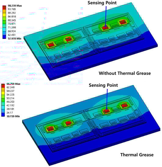 The material properties of the power module used in the steady-state thermal analysis (step 2) are shown in Table 3. The mesh of each component is generated differently. The device, wire, solder, and DBC top copper are generated with a fine mesh. The other component mesh is relatively coarse to reduce the computation time. For the heating source, the results of step 1 are set in wires as the initial values. The measured heat source (total power loss: 129.6 W (with grease), 142.8 W (without grease)) is applied to the four parallel MOSFETs. The steady-state thermal simulation results are shown in Figure 5. Figure 5 shows the temperature distributions obtained with and without thermal grease, respectively. The maximum temperatures are 66.3 and 98.2 °C, respectively. The temperatures of the sensing point are 66.1 and 97.5 °C, respectively. The simulation results have errors about 1%. They are tuned to match the saturated temperatures corresponding to the experiment and FEM simulation.