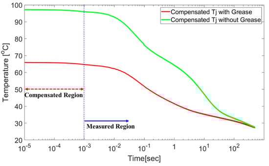 Figure 6 compares the junction temperatures measured by the fiber optics with and without thermal grease, as described in Section 3.1. The green and red lines are the Tj values measured by the fiber optics for the SiC MOSFET. The blue dotted line indicates and distinguishes the measured and undetected regions. The compensated region is the compensated junction temperature obtained using the multi-physics simulation results presented in Section 3.2. The thermal transient simulation data was filled to the measured data. It is fitted to the equivalent response time with the TSEP. After the compensated data are interpolated, as shown in Figure 6, the thermal resistance is extracted using NID (Section 4.3).
