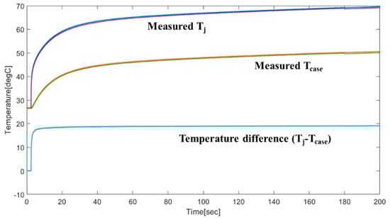 The measurement of the junction temperature cooling curve is carried out according to the following test sequence. When the setup is established as shown in Figure 3, a load current of 120 A is applied by the power source to heat the SiC MOSFET with Vgs = 15 V. After applying the load current, the MOSFETs are heated until the junction temperature is sufficiently saturated. The saturation criterion is that dTj/dt should reach 0.05 °C/s. The power dissipation is calculated by measuring Vds (grease on: 1.08 V; without grease: 1.19 V) and Ids (with grease, without grease, 120 A) using a power source. After the power is turned off, the junction temperature is measured until the MOSFET is cooled. The cooling is continued to ambient temperature (initial temperature of the cold plate). The measured temperature is recorded and monitored in real time using a signal conditioner (DAQ). The measurement results will be described in Section 4.3.