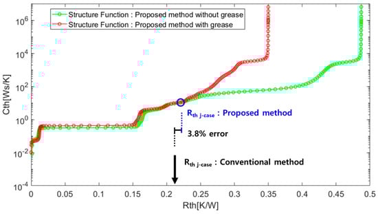 The cumulative structure function is calculated using a commercial software provided from the T3ster Master from Mentor Graphics. The compensated temperature cooling curve in Figure 6 is imported to the software and analyzed to extract the structure function of the proposed method, as displayed in Figure 9. The extracted junction-to-case thermal resistance (Rth j-case: 0.219 [K/W]) is from the device junction to the base plate. The red line is the structure function extracted based on the temperature curve measured with thermal grease, while the green line is that without thermal grease. The blue circle where the separation starts corresponds to Rth j-case the junction to the case. A comparison of the proposed and conventional methods shows an error of 3.8%.