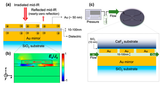 - Le, H.H.T.; Tanaka, T. Plasmonics-nanofluidics hydrid metamaterial: An ultrasensitive platform for infrared absorption spectroscopy and quantitative measurement of molecules. ACS Nano 2017, 11, 9780–9788. [Google Scholar] [CrossRef]