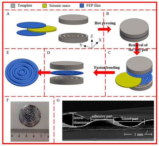 Schematic of fabrication and images of the concentric tunnel fluorinated polyethylene propylene (FEP) films. (A) Stacking sequence. (B–D) are the steps of thermoplastic molding. (E–G) are the schematic model, optical image, and cross-sectional SEM image of concentric tunnel FEP films, respectively.