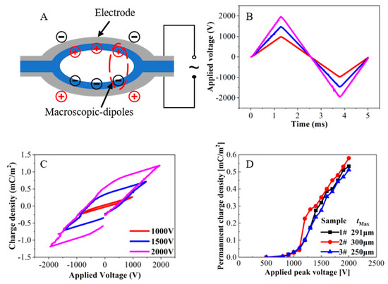 In the following charging step, the concentric tunnel FEP films were first metallized with Al on both surfaces. Then, the internal charging of the tunnels was achieved by contact charging in air with triangular voltages as shown in Figure 2A. The triangular voltages were provided by a ferroelectric analyzer (Radiant Precision Multiferroic II), and their periods in the present case were 5 ms, as seen in Figure 2B. Figure 2C shows hysteresis loops of an FEP sample polarized by various peak voltages. The voltages were applied for many cycles, and always terminated electronically at zero to achieve the maximum polarization. Previous work indicated that the permanent charge density, which is corresponds to the induced charge density on the external electrode, is a function of the applied peak voltage [32]. As shown in Figure 2D, the charge density reached about 0.55 mC/m2 at a peak voltage of 2 kV.