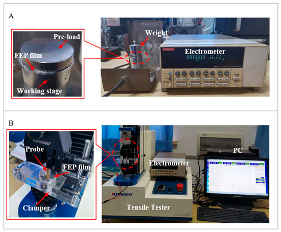 Using the quasi-static method, as a certain external mechanical force, F, was applied to or removed from the sample in the z-direction, the induced charge Q generated on the surface electrodes was recorded by an electrometer (Keithley 6514), thereby directly calculating d33 and Mr following Equations (1) and (2). The quasi-static method was also used to reflect the pressure dependence of the piezoelectric activity in the concentric tunnel FEP films.
