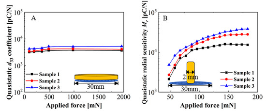 Pressure dependence of the concentric tunnel FEP films with diameters of 30 mm. (A) Quasi-static piezoelectric coefficients, d33, as a function of applied force. (B) Quasi-static radial sensitivity, Mr, as a function of applied force on the centermost area for FEP samples.