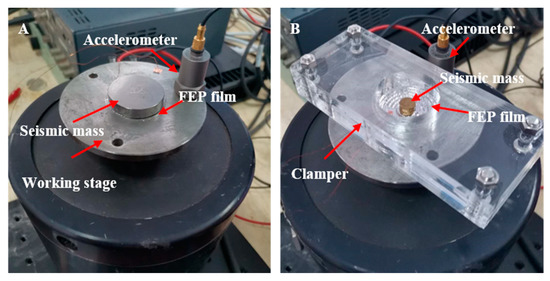 The dynamic d33 coefficient was measured with the setup shown in Figure 5A. The loaded forces on the sample were composed of a static force of mg and a dynamic force of ma [34]. A pre-load with a diameter of 30 mm and a mass of 30 g was placed directly at the top of the sample without adhesion. Thus, during vibration, the acceleration had to be limited to 2.7 m/s2 or less to avoid the sliding of the seismic mass. Meanwhile, the experimental setup for dynamic sensitivity, Mr, is depicted in Figure 5B. The seismic mass placed at the center part had a diameter of 8 mm and a weight of 1.2 g.