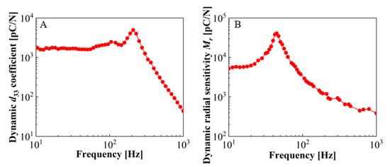 The resulting frequency dependence of the d33 coefficient for a representative sample with a quasi-static d33 coefficient of 4346 pC/N is shown in Figure 6A. The experimental frequency ranged from 10 to 1000 Hz, and the seismic mass was 30 g. As the frequency of the vibration system increased, the dynamic d33 was stabilized over a low-frequency range of 10 to 150 Hz around 1700 pC/N. The piezoelectric response then reached a peak of 4979 pC/N at the resonance around 210 Hz, followed by a dramatic drop as expected. The dynamic radial sensitivity Mr of the same sample with a seismic mass of 1.2 g is depicted in Figure 6B. The dynamic Mr is calculated as 40,900 pC/N at the resonance frequency of about 45 Hz. The radial piezoelectric activity of the sample also remained at a high level at resonance, but decreased significantly with the increase of the frequency above resonance.
