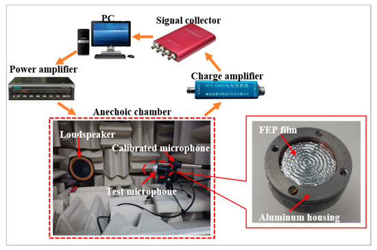 In this work, the acoustic method was also carried out to determine the dynamic coefficient d33 (see Figure 7) [32]. The advantage of this method is that although the surface is uneven, the dynamic coefficient d33 can be determined as an average value by applying a free-field sound pressure, p, on the sample. The 30 mm diameter test microphone consisted of the sample and an Al housing, which was utilized to ensure good shielding for acoustic measurements. The sound source was provided by a computer-controlled dynamic loudspeaker with a 300–1000 Hz broadband response and was amplified simultaneously by a power amplifier (DSPPA MP200PIII). The induced charge, Q, was amplified with a charge amplifier (AFT-0966) and then recorded by a signal collector (MI, VT DSO-2820). In this case, the loudspeaker, the test microphone together with a calibrated quarter-inch microphone (KW-4420), which was used to determine the reference free-field sound pressure p, were all located in an anechoic chamber. The test microphone and the calibrated microphone were placed equidistantly on both sides along the center axis 30 cm from the loudspeaker.