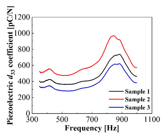 Results of the dynamic coefficients d33 calculated by the acoustic method following Equations (3) and (4) are presented in Figure 8. For the typical samples, dynamic coefficients d33 obtained acoustically were between 300 and 500 pC/N at 350 Hz. The acoustic values were much smaller than that determined by the dynamic method, which was calculated as 800 pC/N at 350 Hz. This must be due to the fact that only very sensitive protruding tunnel parts were excited in the dynamic measurement using a shaker, while the whole sample, including piezoelectrically active tunnel parts and inactive fusion bonding parts, was exposed to the acoustic pressure. Therefore, the averaging piezoelectric coefficients d33 obtained acoustically under uniform acoustic waves are smaller than that obtained by the dynamic method [28]. In addition, there exist two response peaks at frequencies of 415 Hz and 860 Hz, respectively. The resonance peak at 415 Hz may be related to the bending extension in the radial direction under the sound pressure, and the peak at 860 Hz is associated with the well-known diffraction of the acoustic wave in acoustic measurements, which happens when the size of the test microphone is comparable or larger than the square of the wavelength [32].
