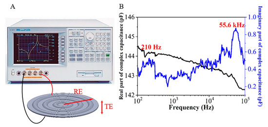 Dielectric responses of a concentric tunnel FEP sample with a diameter of 30 mm. (A) Measurement setup. (B) Dielectric resonance spectrum (DRS) of a concentric tunnel FEP sample.
