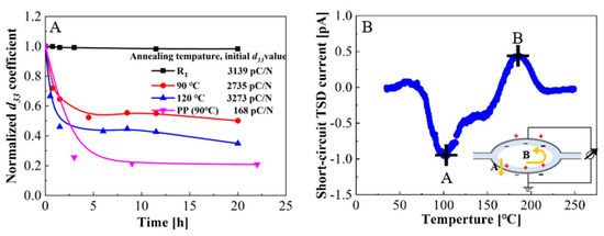 Thermal stability of the concentric tunnel FEP films. (A) Normalized d33 coefficients’ isothermal decay. (B) Short-circuit thermally stimulated discharge (TSD) current spectrum.