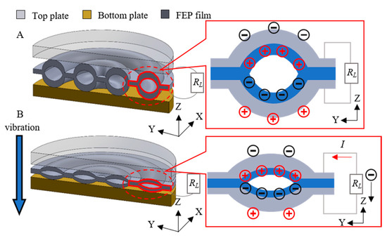 The design and the schematic of the working principle of the 33-mode energy harvester are indicated in Figure 11. The 33-mode energy harvester consisted of a top plate, a bottom plate, and an FEP film. For the sake of restricting the deformation of the film in all directions except vertically, the film was fixed on the bottom plate. Hence, the film remained flat during vibration to avoid the effect of bending deformation. The top plate with the same diameter as the film was used as the pre-load. When an external force was applied on the device, the top plate helped distribute the force evenly to each tunnel, thus deforming the tunnels. During vibration, sinusoidal variations of the air-gap thickness led to the change of induced charge density and thus current, I, in the external circuit.