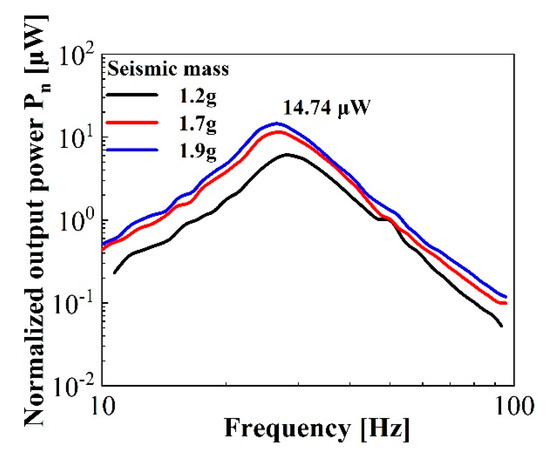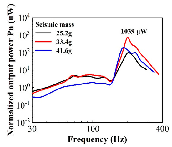 The normalized output power as a function of vibration frequency for a 33-mode harvester under different seismic masses at an optimal load resistance is shown in Figure 13. The sample had a diameter of 20 mm and capacitance of 63.5 pF, and the seismic masses were 25.5, 33.4, and 41.6 g with the same diameter as the sample, respectively. As can be seen, the resonance frequency changed with the seismic mass. Hence, different optimal load resistances were determined using Equation (9). The figure indicates that the maximum power of the 33-mode harvester was about 1039 μW with the seismic mass of 33.4 g and optimal load resistance of 12 MΩ at the resonance frequency of 200 Hz.