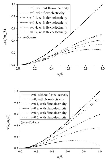 Nonlocal and flexoelectric effects on the normalized deflection of the nanobeam for different thicknesses: (a) h = 50 nm; (b) h = 200 nm.