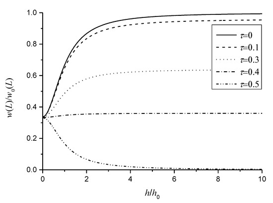 The boundary condition in Equation (21) indicates that nonlocal and flexoelectric effects act as a concentrated bending moment at the free end, which would change the shape of the deflection curve, especially near the free end. Hence, Figure 3 is presented to investigate the normalized deflection at the free end of sensors versus the normalized thickness for the different nonlocal parameters, in which denotes an intrinsic thickness for the maximum induced electric potential of flexoelectric beams [15]. When , the result is identical to the results of flexoelectric sensors [20]. It can also be observed that the normalized deflections at the free end decrease as the nonlocal parameter increases, then decrease rapidly to the same value (as ) with the decrease of the beam-normalized thickness for . When , the variation of the normalized deflection is almost independent of . However, when , the normalized deflection at the free end increases from zero to approach the same value (as ) as the normalized thickness decreases.
