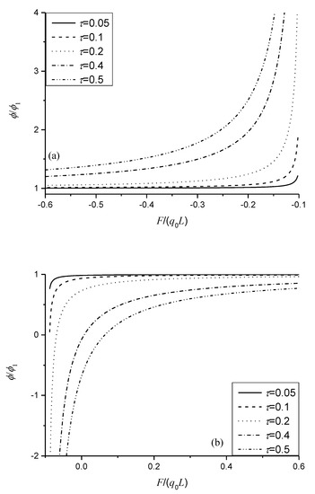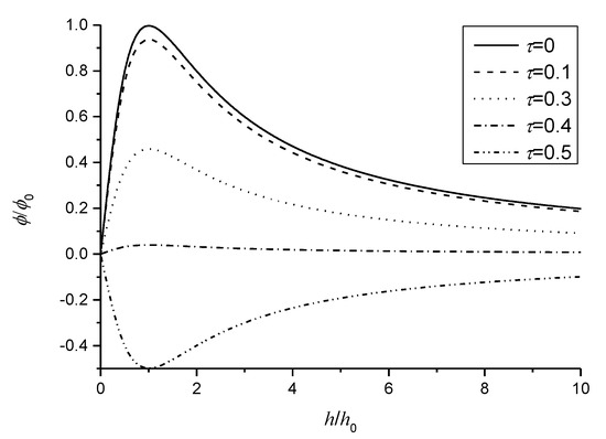 By taking , the nonlocal effect has a significant influence on the induced electric potential shown in Equation (27). Figure 7 is presented to investigate the nonlocal effect on variation of the normalized induced electric potential with respect to . When , the induced electric potential is always strengthened and increases with the increase of the nonlocal parameter and the ratio of , shown in Figure 7a. From Figure 7b, we can also observe that the induced electric potential is weakened by some ratios of and decreases with the increase of the nonlocal parameter with some ratios of . However, the induced electric potential with the nonlocal effect would change the direction along the thickness of the sensors when the ratio of approaches –0.1. This result indicates that the sign of the induced electric potential is fully dependent on the nonlocal effect and the category and nature of the external loads, which would be helpful in understanding or designing nanosensors in which the beam structures act as the basic elements. For given loads such as , materials with large nonlocal parameters could be used to design better sensors. As , materials with large nonlocal parameters can be used only when approaches −0.1. Otherwise, materials with small nonlocal parameters are better options.