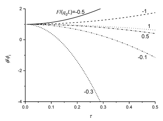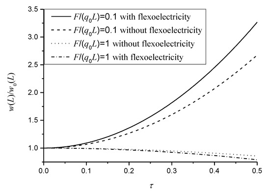 where is the dimensionless scaling effect factor accounting for the nonlocal effect [26,27,28] and . It can be seen from Equation (22) that the bending beam with nonlocal and flexoelectric effects undergoes a smaller deflection than a beam without these effects subjected to the same loads. Substituting Equation (22) into Equation (20), the induced electric potential of cantilever beams with and can be expressed as: