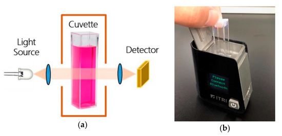 This device can be divided into four parts: (1) light source, (2) cuvette holder, (3) sensor (AS7262: ams, Unterpremstätten, Austria), and (4) microcontroller (Arduino Nano V3.0: Arduino, Somerville, MA, US). We used a white LED to illuminate the sample in the cuvette holder. Light that was not absorbed by the sample was scattered or reflected to our six-channel colorimetric device, which was capable of capturing result signals at a variety of wavelengths, i.e., 450, 500, 550, 570, 600, and 650 nm respectively. The transmissive optical setup and device image see Figure 1.