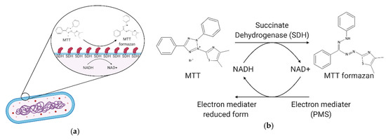 Figure 3. Mechanism of the bacterial reagent assay: (a) schematic diagram of the bacteria reagent assay and (b) MTT-PMS mechanism of our bacterial analytical device. Created with BioRender.com.