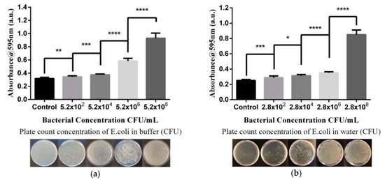 Figure 4. Absorbance value after reaction of bacterial amount and reagent (n = 8), with the vertical axis indicating the mean intensity value of absorbance and the horizontal axis indicating concentration of bacteria in (a) PBS and (b) water. The data are measured using a Tecan sunrise ELISA reader. (* p < 0.05, ** p < 0.01, *** p < 0.001, **** p < 0.0001).