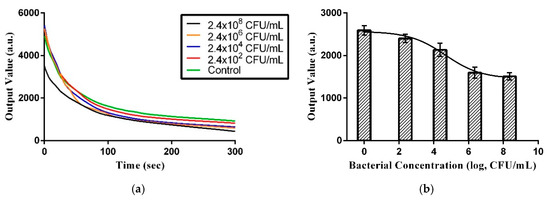 As shown in Figure 4b and Figure 5b, the prediction model in PBS and water uses Hill’s equation model. Three times the standard deviation of the blank test intensity was 332.8665 (n = 8) and 261.75564 (n = 8) in PBS and water, respectively, which was considered the limit of detection (LOD). Fitting that back into Hill’s equation, the LOD for bacterial concentration was determined to be 3.43 × 105 and 1.41 × 106 CFU/mL, respectively.