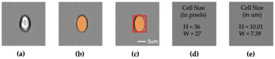 Size measurement pipeline; (a) cell image; (b) segmentation; (c) cell shape; (d) cell size in pixel numbers; (e) cell size in μm; (a–c) share the same scale bar.