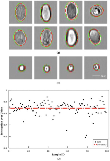 The segmentation results are evaluated with the IoU score between the contour labelled by human operators and the contour predicted by the algorithm. The output of the segmentation algorithm IS depicted in Figure 3a. The top two rows are the results of segmented Giardia oocyte images, and the lowest row is the results of segmented Cryptosporidium oocyte images. In these images, the green line is the ground truth (human labeled), and the red line is the output of the segmentation algorithm. As shown in Figure 3a, the image outputs of the segmentation algorithm are close to the ground truth. Overall, the segmentation algorithm achieved 84.4% in mean IoU (red dotted line) as shown in Figure 3b in which each blue dot represents the IoU of an individual image output of the testing dataset.
