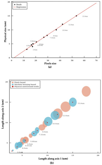 Imaging-based sizing techniques are able to provide a direct measurement of the physical size of particles based on image analysis. Image analysis is an automated method by using intelligent software to analyze results of a huge number of images. Images of microscale and nanoscale particles are usually acquired using imaging-based microscopy. Commonly used image sensors include single-point photodetectors such as photomultiplier tube (PMT) and avalanche photodiode (APD) [21] as well as two-dimensional (2D) photosensor arrays such as charge-coupled device (CCD) or complementary metal-oxide-semiconductor (CMOS) [22]. In a 2D sensing case, the size of individual particle is estimated by converting the pixel to size at a fixed conversion ratio which is determined theoretically according to the specifications of the optical components. For example, a single pixel in images taken corresponds to 0.33 μm with a 60× objective, and 0.5 μm with a 40× objective according to the product specifications. However, it is noticed that this fixed conversion ratio does not always give rise to an accurate particle sizing, probably arising from factors such as the objective error, imaging error, and segmentation error. Hence, the relationship between the pixel number and physical size is difficult to be modelled due to possible nonlinearity.