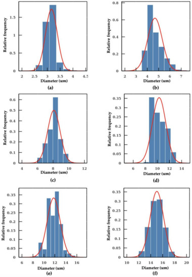 Measurement of individual microplastic particles sizes distribution: (a) 3 μm; (b) 5 μm (c) 8 μm; (d) 10 μm; (e) 12 μm; and (f) 15 μm.