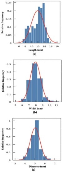 The pipeline algorithm automatically analyzes the pixel information of the target particles and converts the pixel information into actual size based on a machine learning model (Figure 1a–e). First, it generates a contour of the particle using a segmentation algorithm. Then, the contour information is used to estimate the shape of the particle. Finally, the shape information is converted to physical length and width using the pixel-to-size module learnt by a quadratic machine learning model trained with least-squares regression [23] using the spherical beads of known sizes. All the aforementioned operations are integrated into an image processing pipeline to automatically predict the physical size of particles from images acquired using an imaging flow cytometry (Amnis® ImageStream®X Mk II [24,25]).