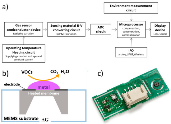 Semiconductor gas sensors function via a change in electrical conductivity when the target gas contacts a ceramic semiconductor surface. This involves an exchange of electrons between the sensing material and the gas upon contacting the sensing material, whereby a reduction–oxidation reaction occurs, providing detection information on the basis of a change in resistance. These sensors react to toxic gas and flammable gas, and the configuration of their detection circuit is simple, allowing simple manufacture and mass production. However, their specificity is hampered as changes in electrical conductivity also occur in response to nontarget gases. Semiconductor gas sensors are often used as TVOC and CO2 sensors for measuring indoor air quality [8]. There are two types of semiconductor gas sensors: gas sensors (bulk) and gas modules (gas sensor modules). Semiconductor gas sensors and modules consist of a semiconductor gas sensor element, a heating circuit, a sensing material R–V conversion circuit, an analog-to-digital converter (ADC) circuit, a microprocessor, an ambient environment measurement circuit, a display device, and an I/O circuit. The detailed features of a semiconductor sensor are shown in Figure 1.